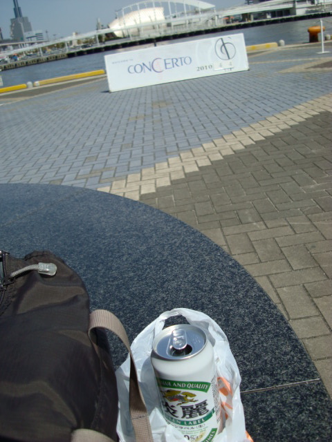 昼飯は船見ながら、近所のデパ地下の出店の100円パン(ベーカリーの総菜パンが全部100円)と発泡酒500缶。