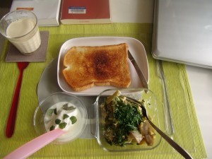 今日の朝食です。なんかもう、イタパセの花芽をふりかけにして食べていたり、