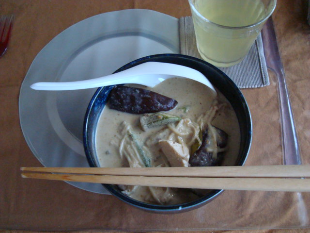 タイカレー。今回具を大胆に変えてみました。オクラとえのきどっさり入り