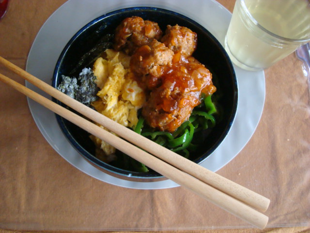 のっけ丼はお弁当の具みたいのを、何も考えずにごはんに全部のっければできあがりです。