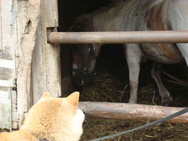 午後は馬のいる牧場へ。 馬を初めて観る元実家犬