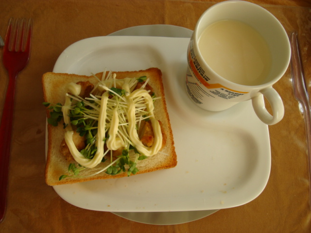 食パンにのっけてかいわれとマヨでジャンクなオープンサンド風にしてみました。