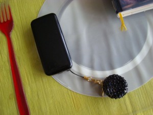 濃紺+青ラメの携帯とよく似合ってます。ぼてっとしたルックスも気に入ってる。