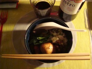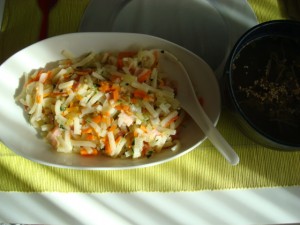 新規で米やパンが入手できない(パンとか自作しようにも強力粉も卵もないからどうしようもない)ので炭水化物はあるもので代用する。これはうどん炒飯。そばめしみたいなもんでしょうか。こぶ茶味でけっこううまかった。何げに使えるiPhoneアプリ『ふるカトキチ』を参照。
