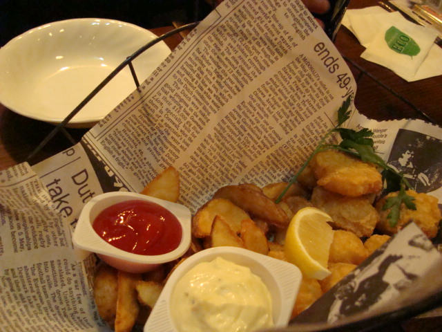 オーダーしてから気づいたんだけど、フィッシュ&チップスにモルトビネガーが付くのGOOD![]()
