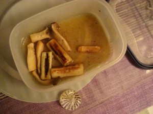 焼き葱とエリンギのマリネ。保存食のつもりだったのにタッパーからつまみぐいしてたらこれしか残ってない