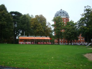 行く途中にある大きな公園 このピンクとオレンジのカフェの色の組み合わせどツボです