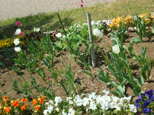 ヨットが見えるところには公園もあり。チューリップとパンジー中心の花壇がなつかしい感じ