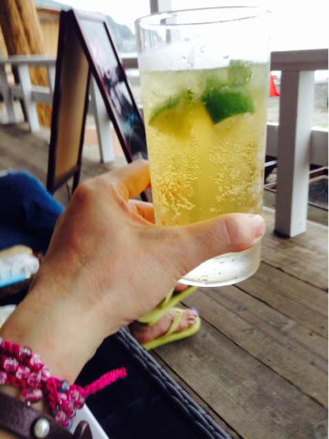 おしゃべりしながら寒々しい海をぼけっと眺めつつ、モヒート風カクテルとコロナでかなりいい気分。