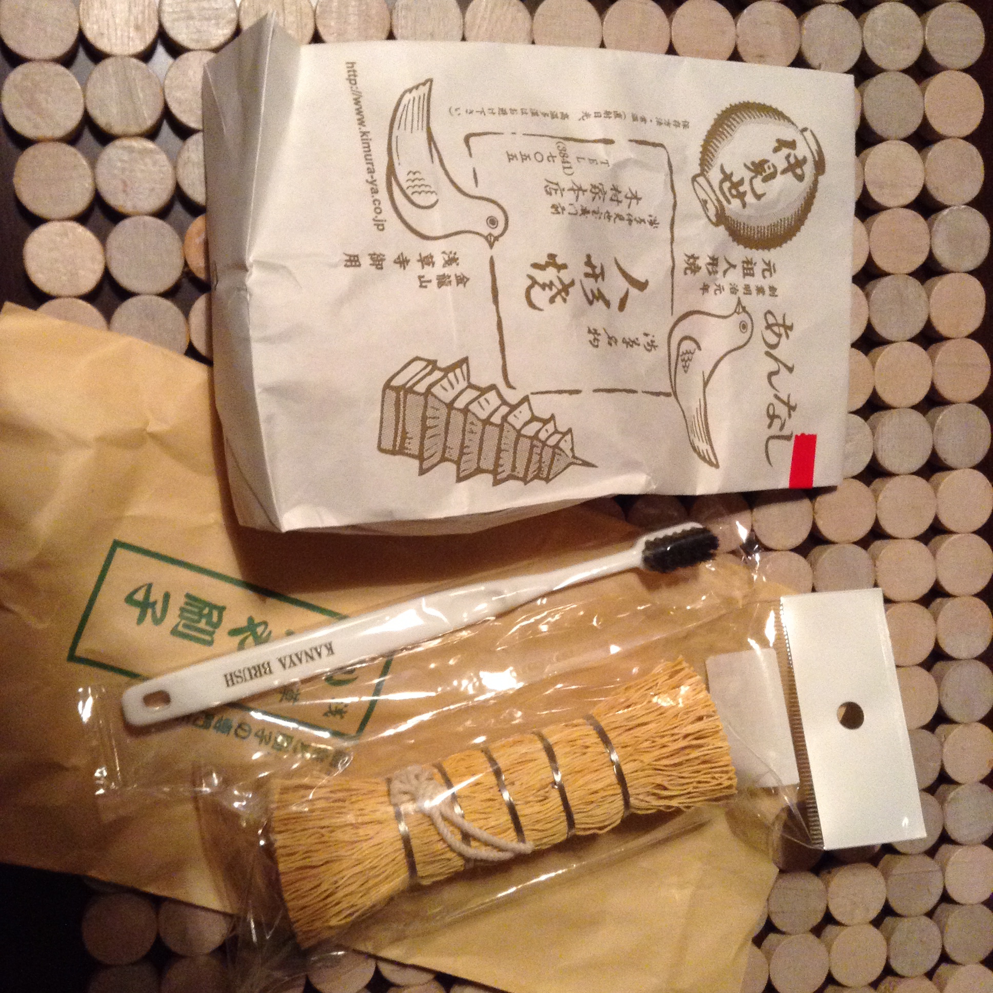 浅草みやげは人形焼(あんなし)と鉄板ブラシと馬毛歯ブラシ