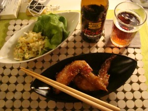 手羽先ならってことでホッピーまで買い&仕事中に作成したポテサラで夕食。