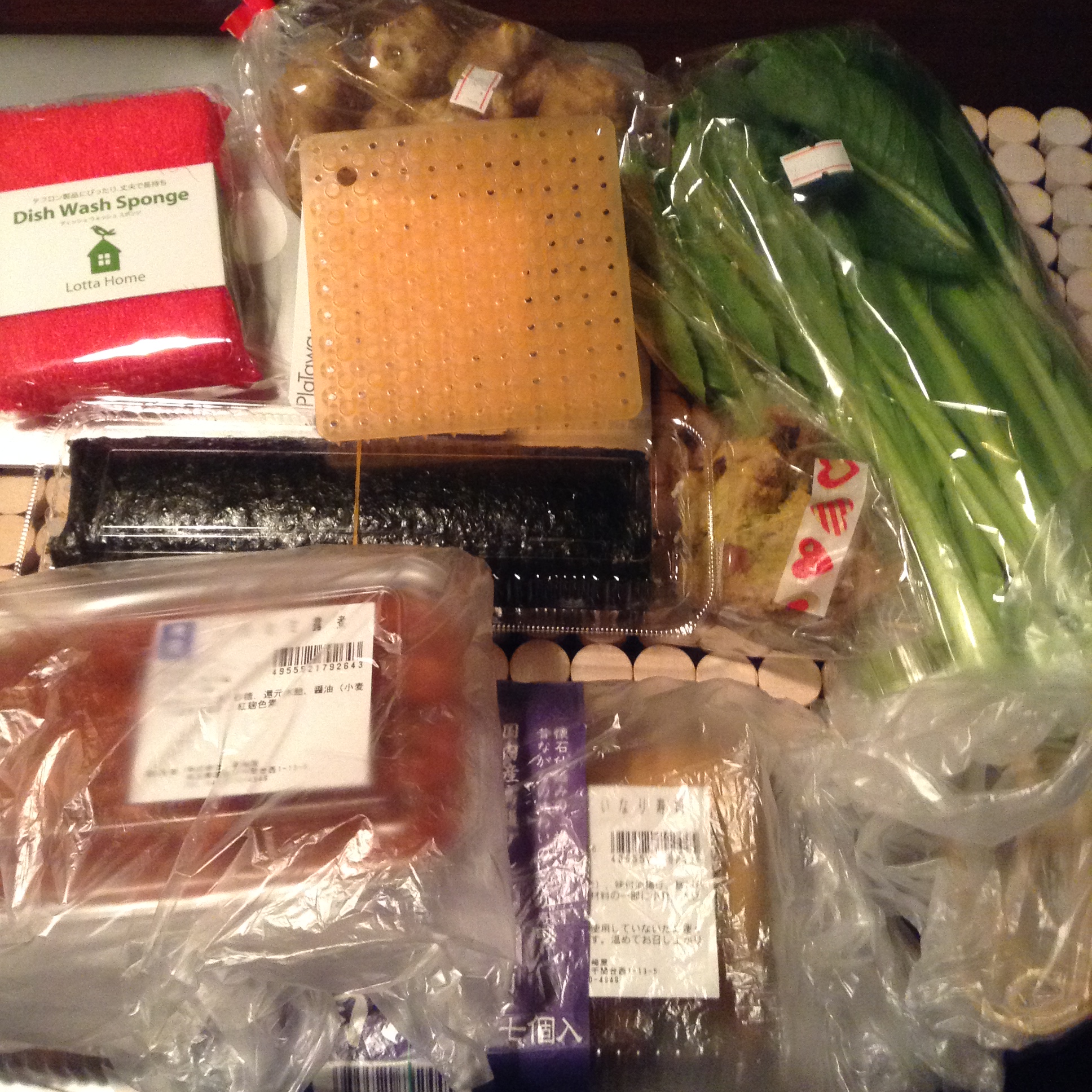 野菜色々、巻き寿司、スコーン、激安稲荷寿司、川エビの総菜、台所用品