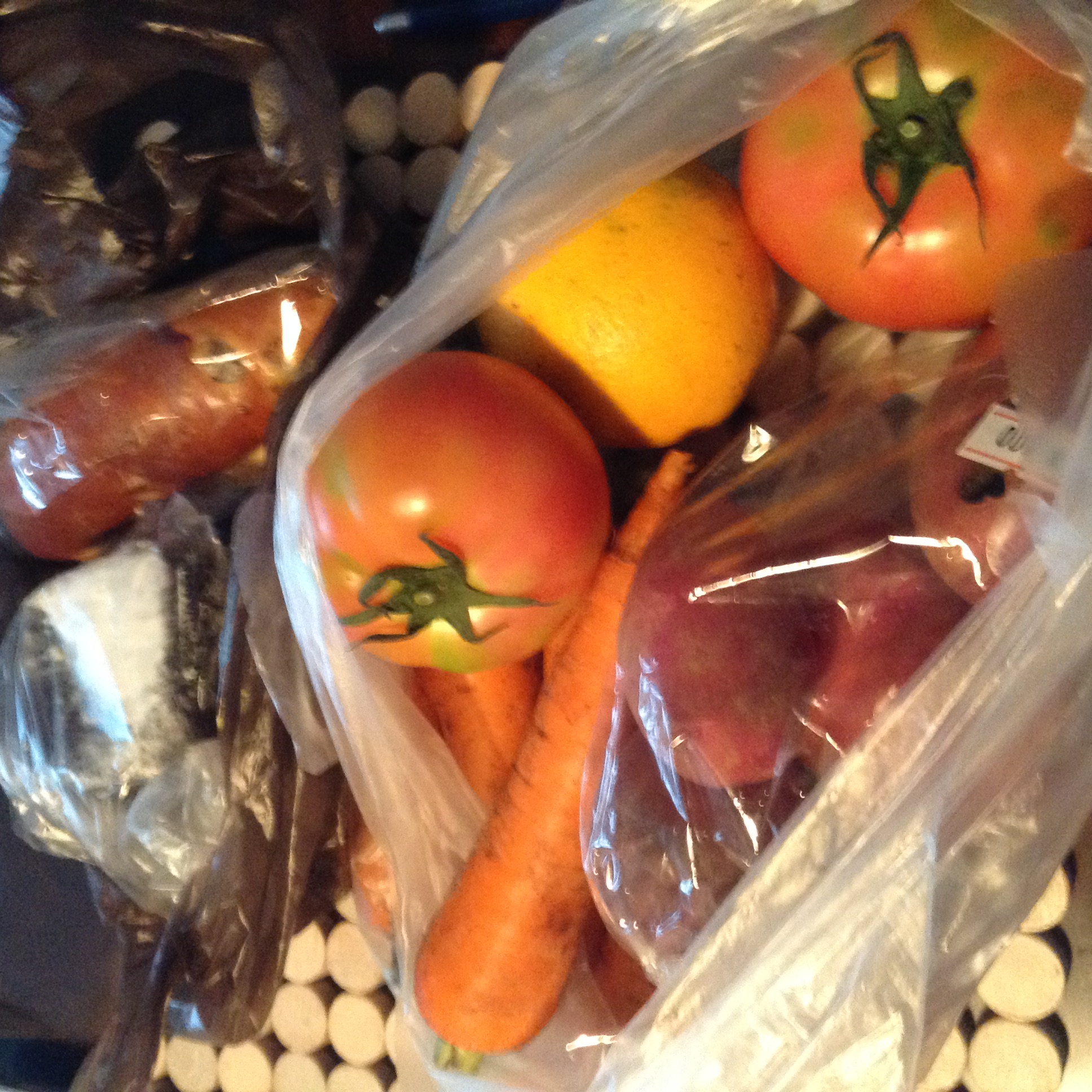 直売野菜はトマト、赤いじゃがいも、にんじん、バレンシアオレンジ