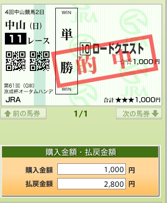 これが例の予想会で始めたノミ屋ゲーム用の購入馬券!的中してるけど、なんかオッズがだだ下がりしてるし土曜に1000円スってるのでまだ儲けは800円笑