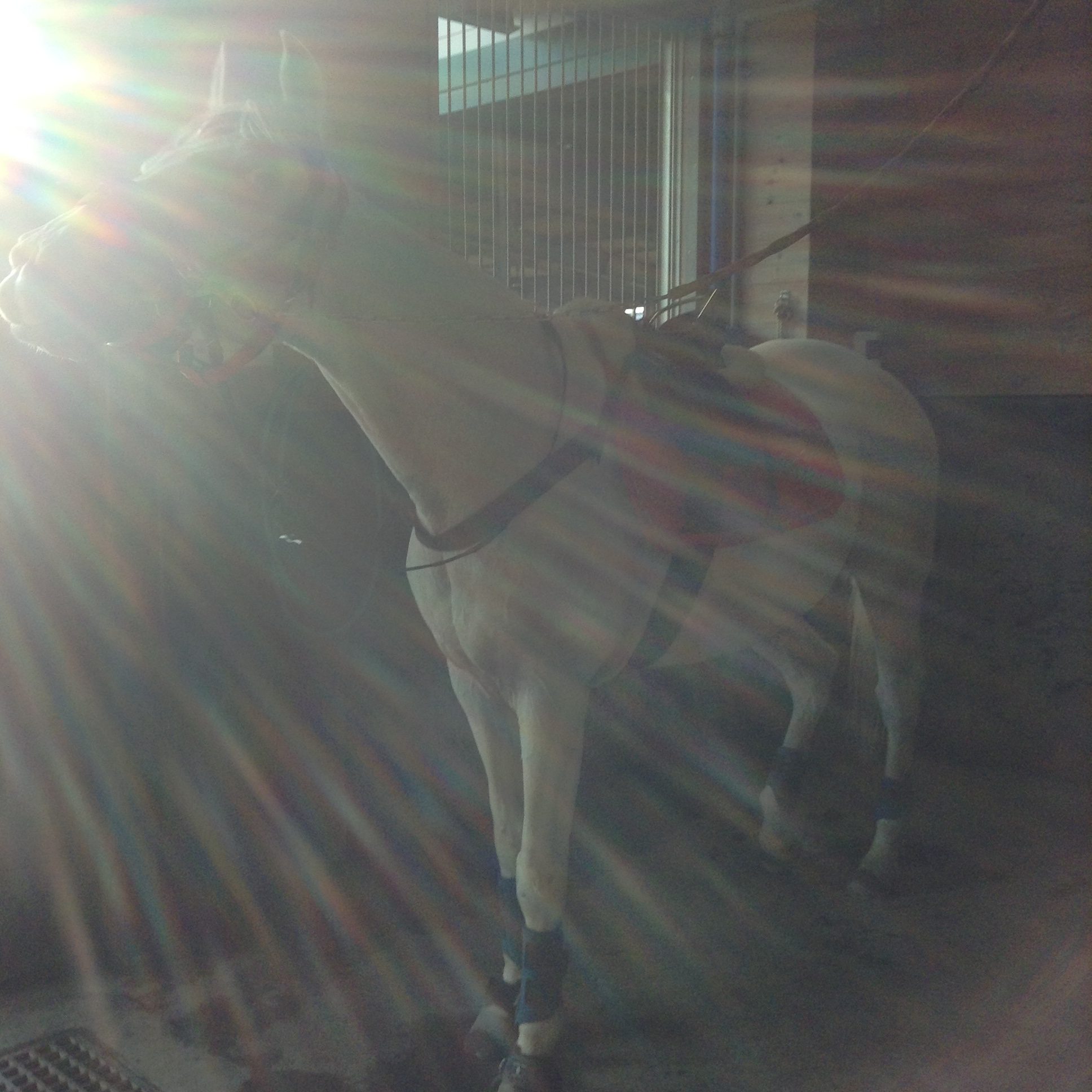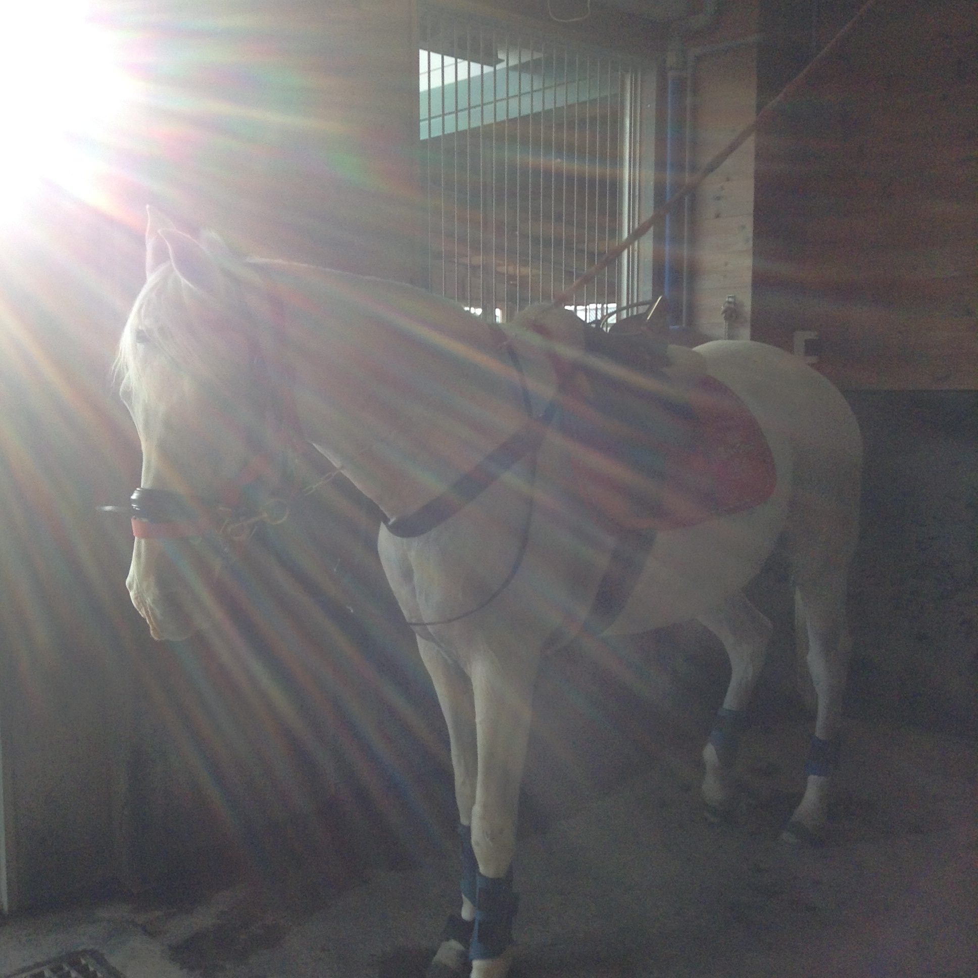 G1の誘導馬みたいなかっこいいゼッケンをつけた神々しい葦毛くん