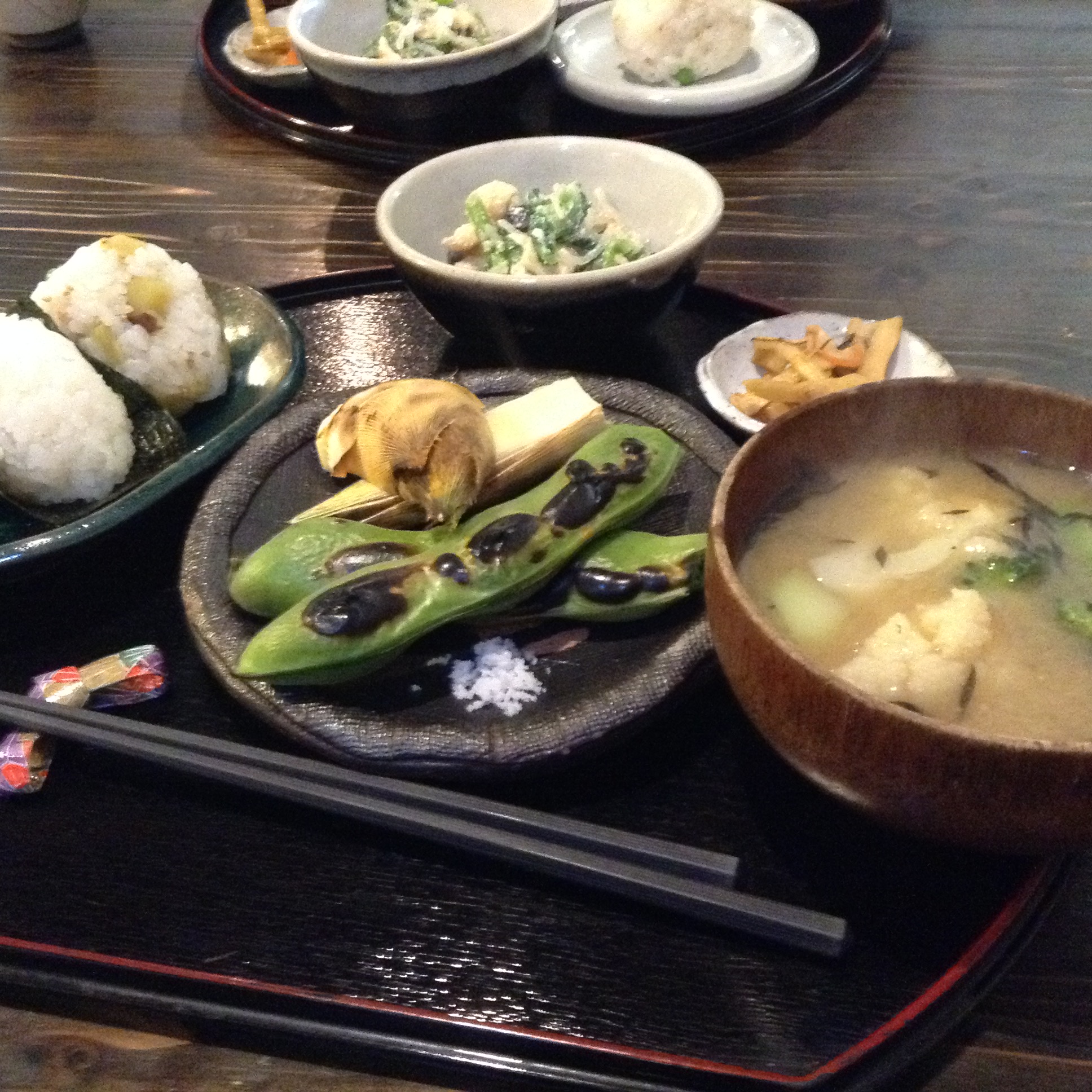 メインは早堀り筍と蚕豆の丸焼きに塩をつけて食べるっていう渋い献立。