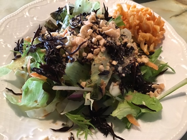 ひじきやナッツ入りのサラダ パスタが少しだけついてるのとドレッシングの酸味加減が好み。