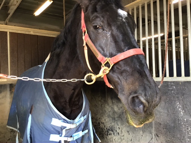 そしたらたまたま、乗った馬の馬房の近くでグルーミングしてた厩務スタッフさんが「青汁(青草まみれのよだれのこと)浴びた〜💦」とか言ってるので興味しんしんで覗きに行ったら、案の定この馬!やっぱな〜って感じでしたよ。口元がだら〜〜〜んとしてる上にくしゃみっぽいのも容赦無く浴びせてくるので予断ならない(不健康でこうなってるのではないですよ)。20代で割と歳行ってるからってのもあるとはいえ、結構若い頃からこうだったのでは?と思わせる雰囲気がある。他の20代の牡馬(セン馬)たちだってもっと全然清潔感あるし、ここまでこんな感じの馬ってなかなか稀有な存在と思われます。タオルで顔を拭かれるのが嫌いらしくて、ほっといたら目の辺も凄いことになってしまいます笑