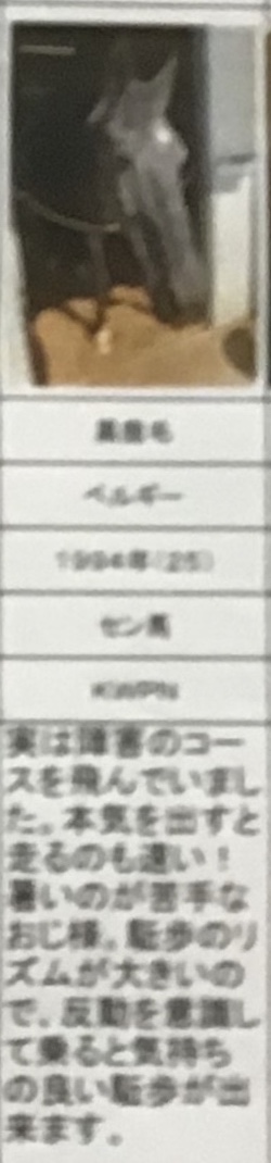 このブログにたまに貼ってるこの表は、前にクラブで期間限定で張り出されてた馬一覧表を慌てて撮影しておいたものだけど、この馬のとこだけ特に写りがボケボケで馬種がわからんのですが、ベルギー出身だったのか。なんか結構乗馬としては血統とか良い馬なのかもだったりして、、、