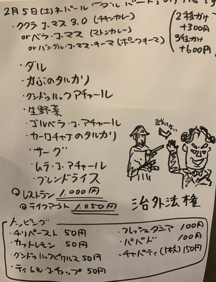 ↑この日のダルバートのお品書き。正直見ても何がなんだかわからないのですが、コ・マス、タルカリ、アチャールという単語は一通り覚えておこう。カレー以外は全てベジですごくヘルシーな感じです。ライスはもっと多めでも行けたかも
