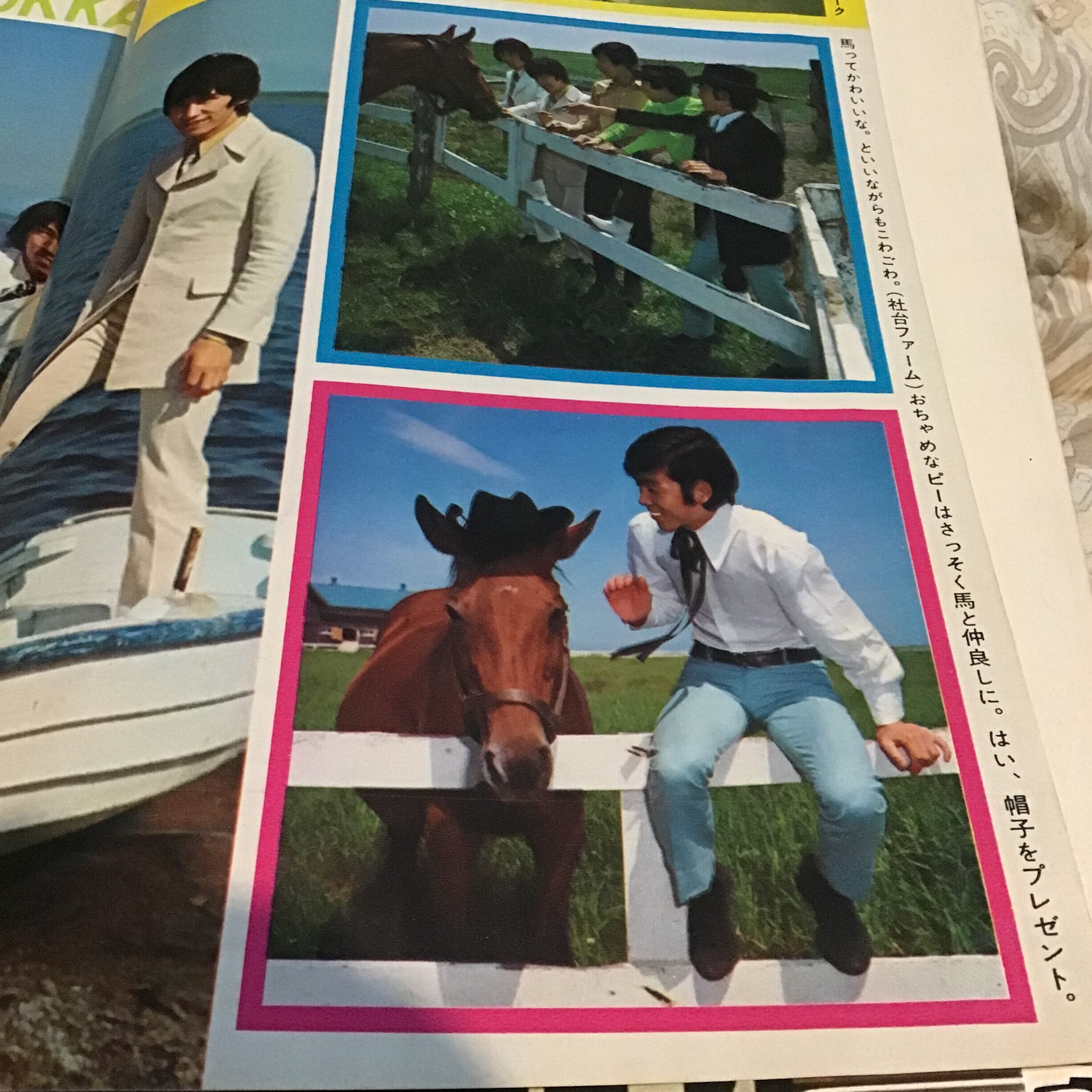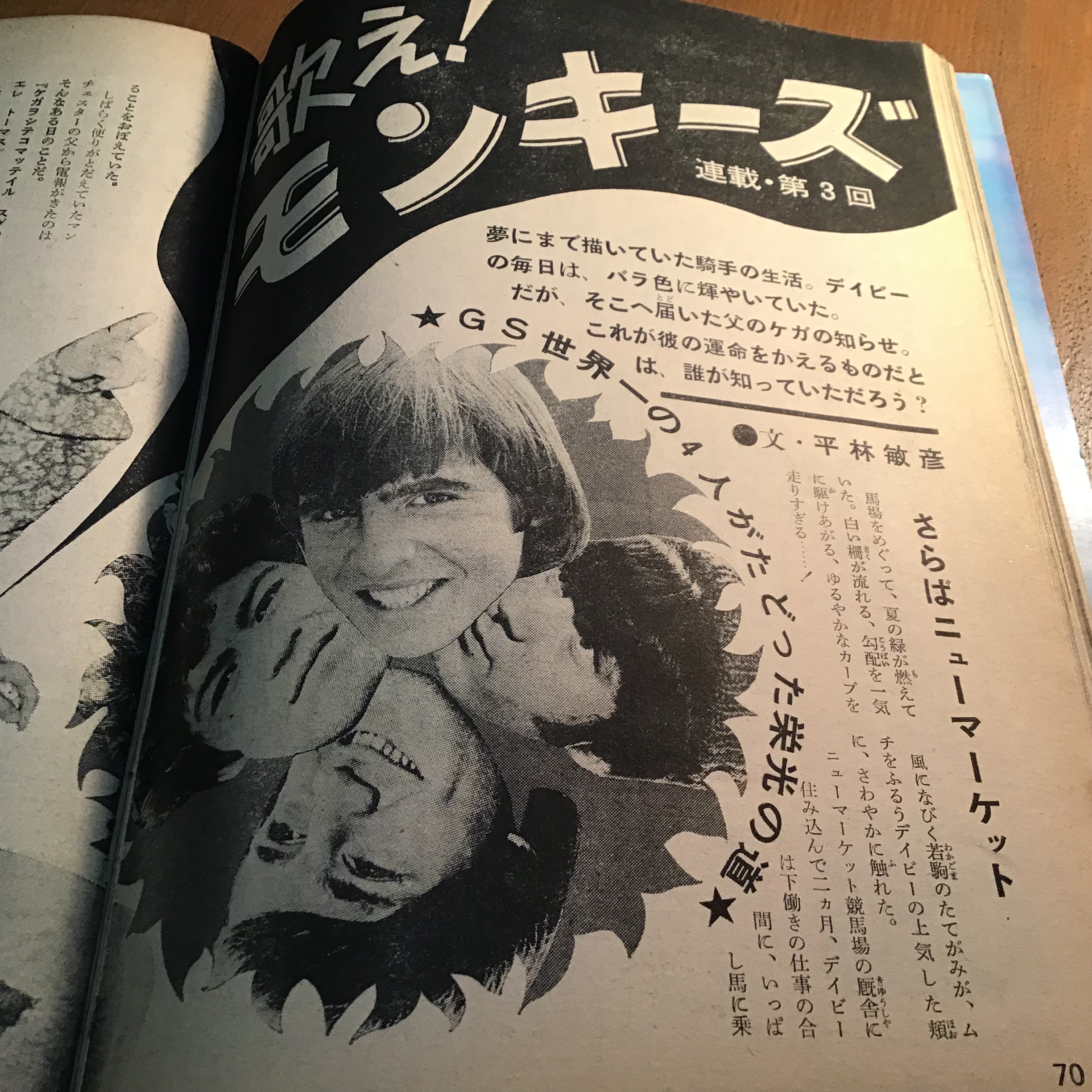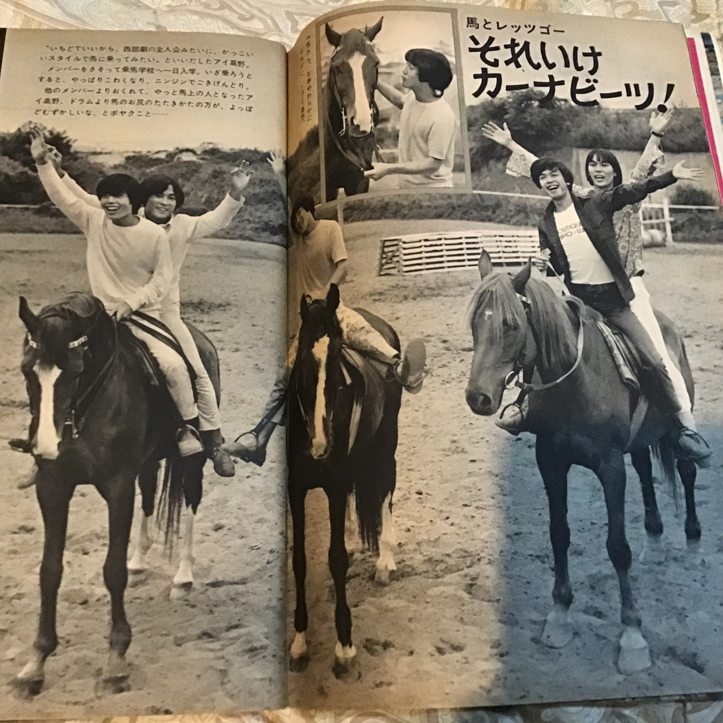 ↑日本のGSの面々もわざわざ社台ファームなどに出向いて馬と触れ合っているけど、キャプションに「こわごわ」「こわい」「難しい」と強調してあるのが気になります笑 確かに今と比べるとこの頃の馬の方が野生味が残ってそうではあるが、モンキーズに比べてやわすぎる!😆 まあこーいうのも演出の一部なんでありましょう。